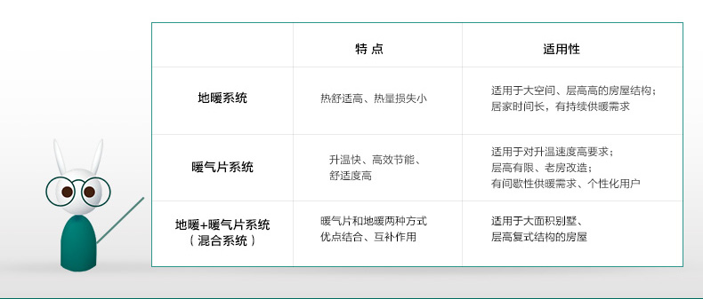 由于散熱片和地暖系統(tǒng)的不同特點,在選擇時客戶可根據(jù)自己的家庭人口情況、使用的習慣、使用的時間、對溫度的要求選擇適合自己的供暖形式,如家里有老人、小孩,暖氣需要長期開,地暖可能更舒適,如有的家庭是早出晚歸,在家時間并不長,選擇散熱片升溫快,使用費用也好控制等等。
